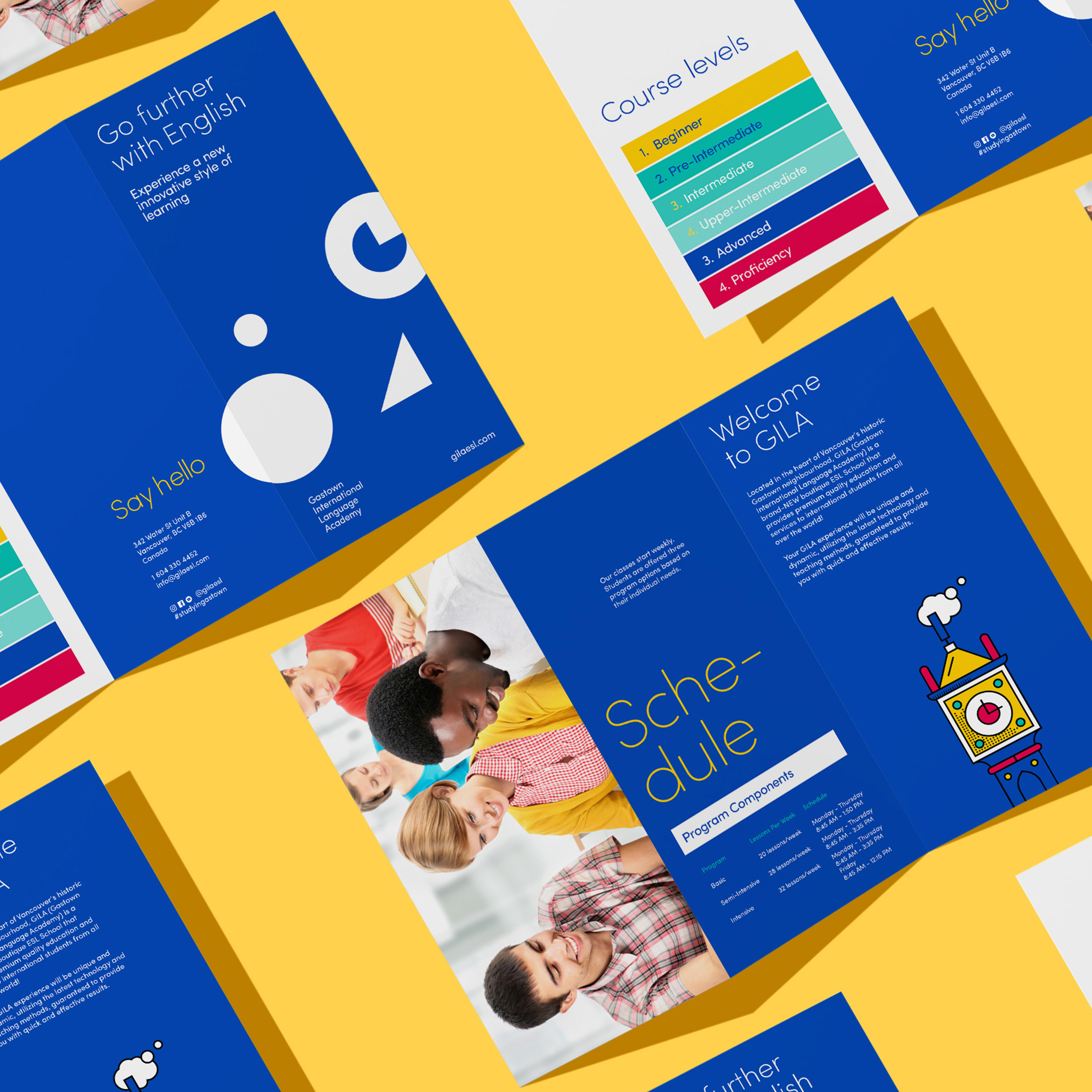 學(xué)校標(biāo)志設(shè)計(jì)的靈感來自蓋斯鎮(zhèn)最著名的地標(biāo)——蒸汽動(dòng)力時(shí)鐘。同時(shí)還實(shí)施了 Gastown 最初的“G”和一些代表學(xué)院提供的創(chuàng)新學(xué)習(xí)風(fēng)格的形狀。所選擇的顏色描繪了現(xiàn)代 ESL 學(xué)校提供優(yōu)質(zhì)教育服務(wù)的不同語言和文化群體的想法。
