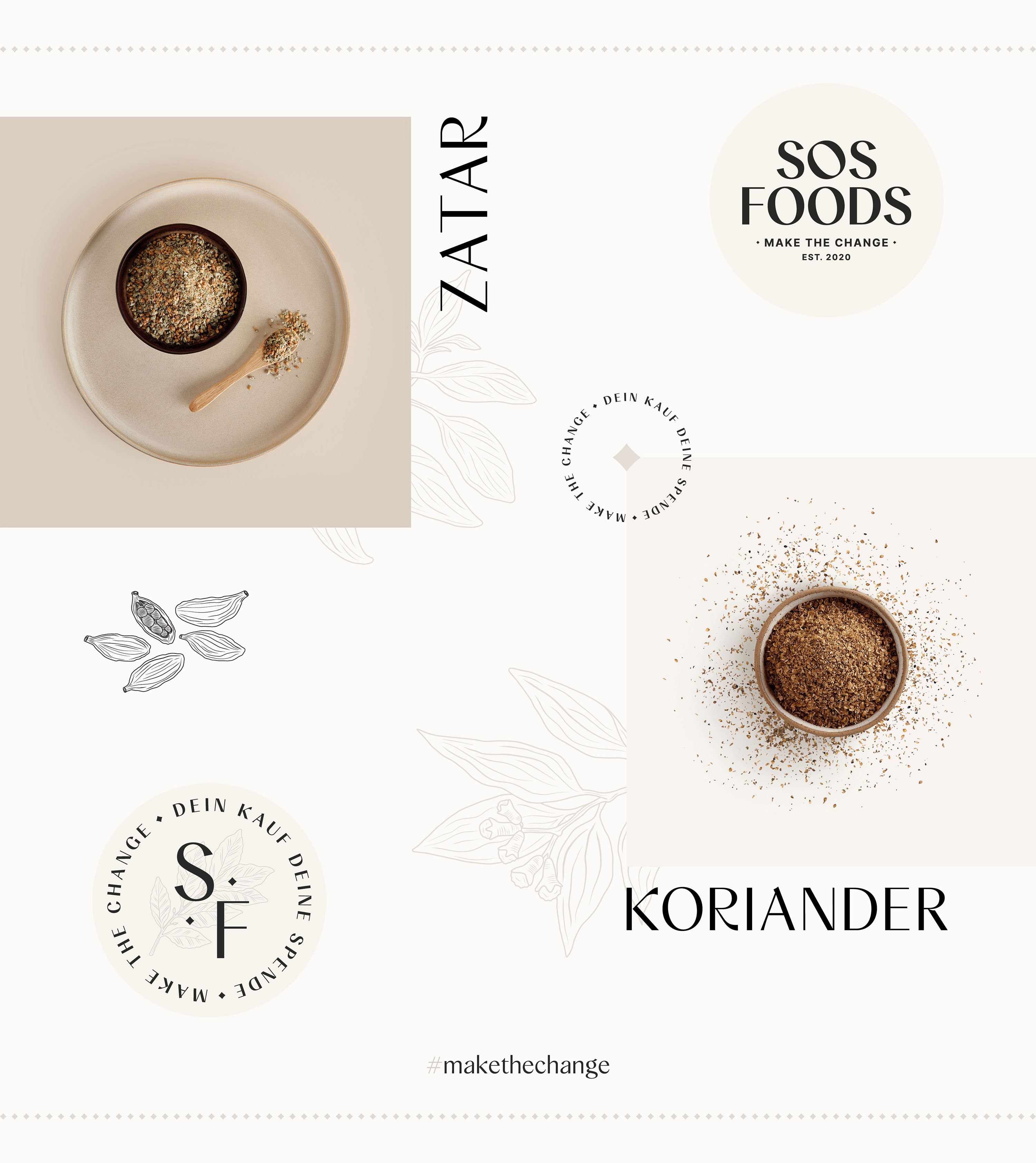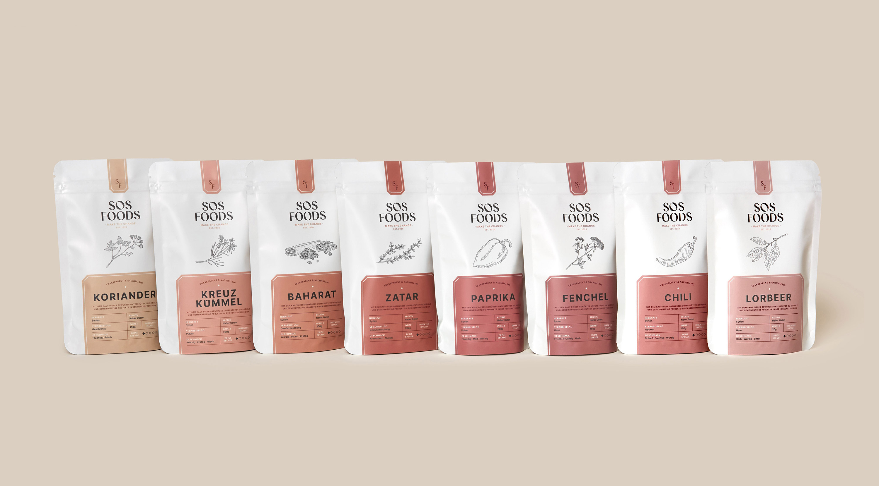 我們?cè)诎b設(shè)計(jì)中加入了許多小細(xì)節(jié)。透明度的想法是兩位創(chuàng)始人 Felix & Rami 最重要的觀點(diǎn)之一。因?yàn)闆](méi)有什么可隱瞞的,所以一切都在產(chǎn)品上透明地傳達(dá)。小菱形還顯示了捐贈(zèng)的百分比。為了在視覺(jué)上支持透明的理念,所有重要的信息,如香料的來(lái)源、加工和口味,都以表格形式傳達(dá)。作為包裝的核心設(shè)計(jì)元素,我們選擇了精美的手繪插圖。每個(gè)產(chǎn)品都有自己獨(dú)特的線條圖,這些線條圖在網(wǎng)站上栩栩如生。產(chǎn)品系列柔和的顏色漸變、菱形圖案的設(shè)計(jì)、包袋底部的隱藏信息——所有這些都為 SOS Foods 的外觀錦上添花。