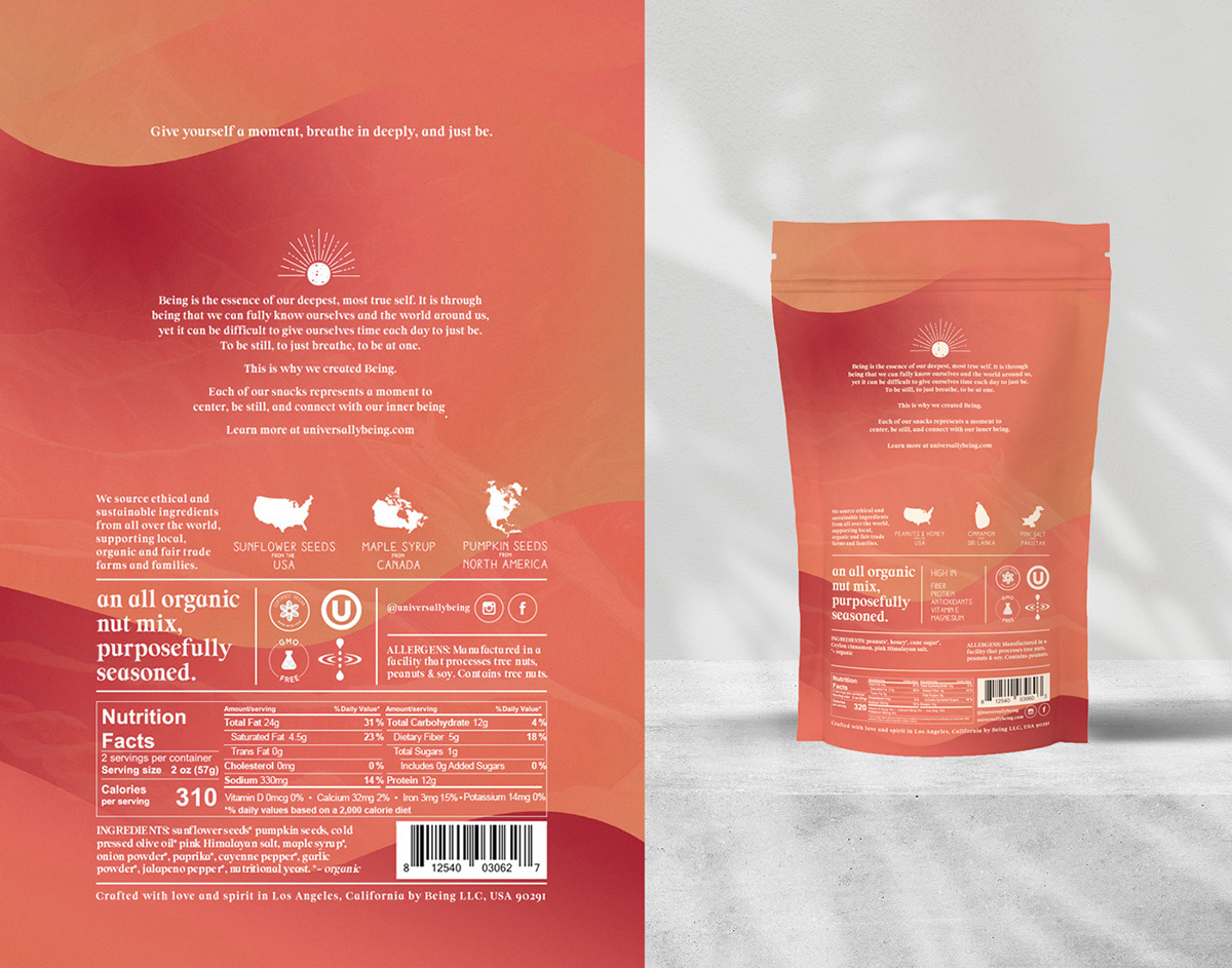 極簡主義:查看市場和類別,我們發(fā)現(xiàn)很少有產(chǎn)品在調(diào)味混合堅(jiān)果領(lǐng)域競爭,并希望整個(gè)包裝都能反映出這不是您常用的堅(jiān)果類零食。我們的目標(biāo)是讓人賞心悅目,讓心靈平靜,只提供完美代表產(chǎn)品本身的基本信息:沒有添加劑,沒有炒作,只有來自大自然的基本成分。